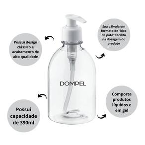 O frasco com Válvula Pump Dompel possui design clássico e acabamento de alta qualidade. Sua válvula em formato de “bico de pato” facilita na dosagem do produto. Fabricado em material PET transparente, possui capacidade de 390ml. Comporta produtos líquidos e em gel.