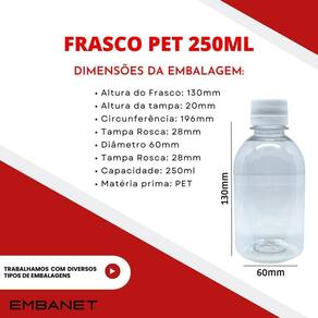 O kit inclui 25 garrafas PET transparentes e 25 tampas de rosca com lacre. As especificações técnicas são as seguintes: altura do pote de 130 mm, altura da tampa de 20 mm, diâmetro de 60 mm, circunferência de 196 mm, gargalo de 28 mm e capacidade de 250 ml. A matéria-prima utilizada é o PET.