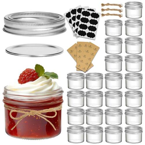 - Conteúdo da embalagem: 24 frascos de vidro pequenos de 113 g, 3 barbantes, 30 adesivos, 32 etiquetas pretas. Estes frascos são adequados para necessidades em massa. Ideal para situações de grande quantidade.