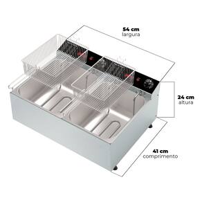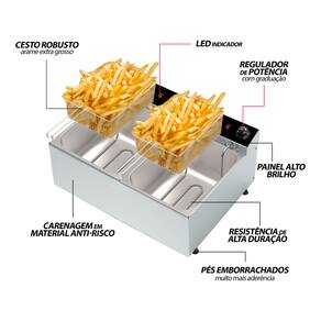 FRITADEIRA ELETRICA 2 CUBAS DE 5L: Esta fritadeira e a revolucao das fritadeiras eletricas, com uma resistencia de mega resistencia, consegue fritar os alimentos muito mais rapido e deixá-los muito mais crocantes. Com termostato automatico, voce apenas deve definir a temperatura que deseja e a resistencia ira se desligar e ligar sozinha para manter a temperatura definida.