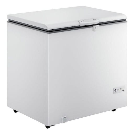 Características: Marca: Consul Modelo: CHA31FB Capacidade total: 309 litros Tipo de degelo: Manual Tipo de freezer: Horizontal Modos: Refrigerador e freezer Painel: Eletrônico Quantidade de portas: 1 porta Controle de temperatura: Sim Material interno: Liga metálica de alta resistência à corrosão. Dreno: Sim Pés com rodízios: Sim Travamento da porta com chave: Sim Cestos internos: Sim Eficiência energética: A Potência: 110V: 124 W | 220V: 113 W