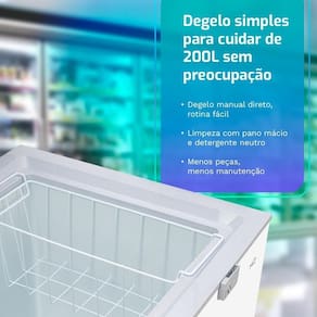 Com 200 litros, ele atende muito bem quem quer congelar carnes, porções, refeições prontas, sobremesas e gelo, mantendo tudo organizado e fácil de acessar. E o ponto que mais pesa na decisão, ele combina capacidade com baixo consumo de energia, com 24,40 kWh/mês para você usar com tranquilidade no dia a dia. Para completar, traz recursos práticos como rodízios + pés ajustáveis, puxador embutido e trava externa na tampa.