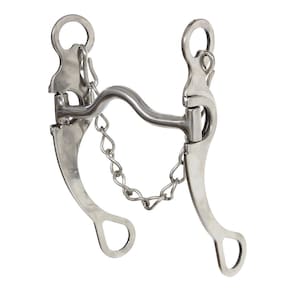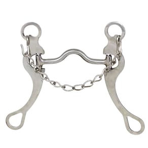 Freio da nossa marca exclusiva Bronc-Steel modelo corretivo fabricado com hastes de aço inox articuladas e bocal liso fixo de ferro com portal baixo. Acompanha barbela de corrente em aço inox.