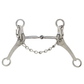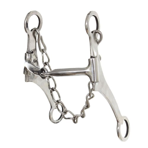 Freio modelo L da nossa marca exclusiva Bronc-Steel fabricado com hastes de aço inox articuladas e bocal liso fixo de ferro também articulado. Acompanha barbela de corrente em aço inox.