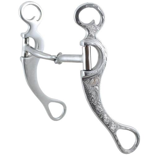 Freio importado Metalab modelo ALUMINUM, fabricado em alumínio, bocal de ferro liso com uma articulação no centro e assentos com fios de cobre encravados. Hastes de alumínio articuladas com detalhes trabalhados.