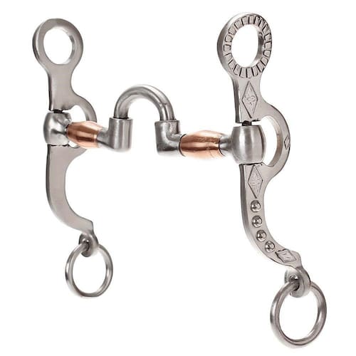 Freio Metalab importado modelo Spanish Brushed Correctional Level 3, fabricado em aço, bocal com roletes de cobre, duas articulações e portal baixo no centro. Hastes articuladas trabalhadas em chapinhas e rebites de metal com argolas articuladas na base.