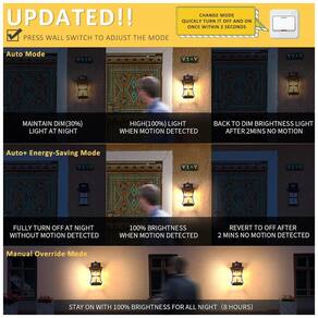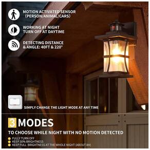 Smart PIR Motion Activated Dusk to Dawn IC Sensor As luzes externas avançadas têm 3 modos de iluminação inteligente. O sensor de movimento é programado para ser automático e tem opções para atender a sua necessidade. A luz da parede externa pode ser totalmente desligada sem ativação por movimento e voltar para 100 de brilho assim que o movimento for detectado. A luz da varanda mantém pouca luz sem movimento ativado ao anoitecer, ativado com 100 de luz e volta ao baixo brilho após 120s. Também pode ficar com 100 de brilho à noite por 8Hs Marca: Não Informado