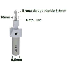 Fresa Escareadora 90º Reto X 10mm Com Broca 3,5mmA RADIX possui uma ampla linha de produtos, como: fresas, fresinhas para tupia manual, serrilhas debrum, escareadoras, brocas para dobradiças e puxadores, riscadores manuais para fórmica, passadores de cola e acessórios, que são comercializados em todo o território brasileiro.Um escareador é uma ferramenta muito parecida com uma broca, com a diferença de que seu uso é feito para a realização de um processo de usinagem, onde o furo é alargado, para que a cabeça do parafuso possa ser embutida na peça, deixando-a plana. É muito importante adquirir um escareador de furos que seja ideal às necessidades de cada serviço, para garantir sua eficiência.Estrura da peça em aço de alta resistência e arestas de corte em metal duro pastilha de tungstênio de alta qualidade.Ferramentas profissional, ideal para quem busca mais qualidade, mais durabilidade e o melhor custo-benefcio.Quando o serviço exigir uma maior remoção de quantidade de material realize-o em mais passadas.Componentes incluídos na embalagem:Código: 22B1035.0401- Fresa Escareadora01- Chave Allen01- Broca de aço rápido 3,5mm Diâmetro de Corte: 10mm Broca de aço rápido: 3,5mm Haste: 9,5mm Corte Reto: 90 GrausObs: Evite usar a ferramenta no limite máximo, forçando-a em demasia, isso pode ocasionar quebras e danos à ferramenta.Atenção: Imagem meramente ilustrativa, podendo conter alguma diferença em sua tonalidade.