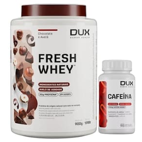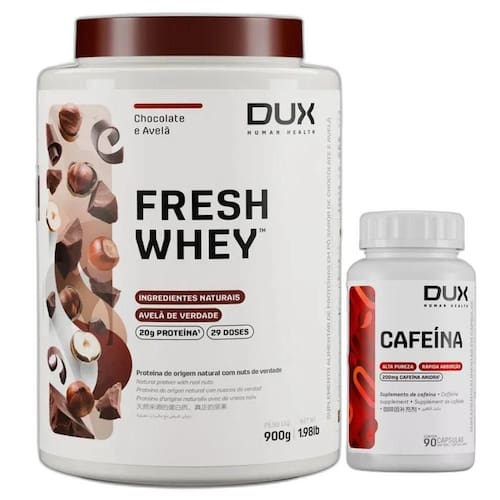 Fresh Whey DUX Nutrition É uma nova categoria de proteínas, totalmente naturais, feitas com frutas e nuts de verdade, que proporcionam sabores reais, com uma fórmula rigorosamente limpa e pura. Sua fórmula especial com 3 tipos de proteínas do soro do leite: concentrada, isolada e hidrolisada. Essa combinação traz o melhor de cada uma delas: sabor, pureza e qualidade. São 20g de proteína por dose, com alta qualidade e sabor delicioso. Fórmula rigorosamente limpa e pura, feita exclusivamente com matérias-primas naturais, sem ingredientes inferiores ou artificiais. Sempre que você precisar se preparar para um treino ou competição, de energia extra e foco durante o dia, ou ainda acelerar o seu cotidiano, a cafeína é sua opção. Benefícios: Máxima Energia; Absorção ultrarrápida; Desempenho otimizado; Pura fonte de cafeína; Pré-treino e termogênico; Foco e concentração; Totalmente natural. Como Tomar: Pré-treino moderado: consumir 1 cápsula contendo 200mg de cafeína por dosagem 20-30 minutos antes. Pré-treino intenso: consumir 2 cápsulas contendo 400mg de cafeína por dosagem 20-30 minutos antes. Dia a dia: Consumir 1 cápsula contendo 210mg de cafeína por dosagem a qualquer hora.