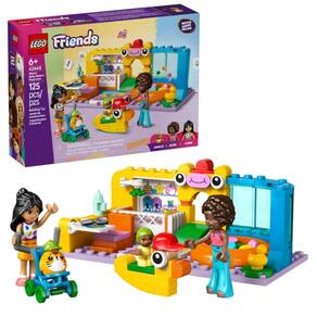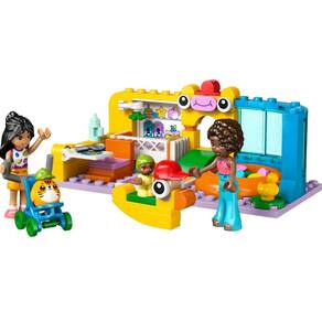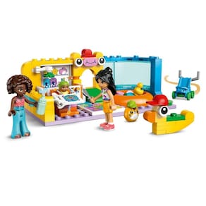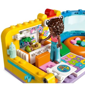 Inspire as crianças a construir a sala de jogos, onde Aliya e Liann estão cuidando da irmãzinha de Aliya, Amalia. Há tudo o que as crianças precisam para criar histórias de amizade. Elas podem alimentar o bebê na mesa – uma função inteligente de virar mostra quanta bagunça um bebê pode fazer na hora das refeições! Quando é hora de tirar uma soneca, há um berço para Amalia. A hora da brincadeira também é servida, com um escorregador, tapete de brincar, piscina de bolinhas, um passeio de pato de balanço e uma linda peça LEGO estilo pelúcia. Então, os amigos levam Amalia para passear no carrinho de bebê.