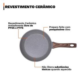 Distribuído por feheros shop Frigideira 20cm antiaderente premium revestimento cerâmico fundo triplo indução 4mm Atenção A frigideira 20cm antiaderente premium cerâmica é a escolha ideal para quem busca eficiência, praticidade e elegância na cozinha. Produzida em alumínio de alta resistência com fundo triplo e revestimento cerâmico antiaderente ppg, garante um preparo uniforme dos alimentos, com menor necessidade de óleo e sem que os ingredientes grudem na superfície. Perfeita para preparar ovos, carnes, legumes ou panquecas com rapidez e segurança. Compatível com todos os tipos de fogões, incluindo gás, elétrico, vitrocerâmico e indução, esta frigideira é pensada para facilitar o dia a dia, unindo tecnologia, qualidade e um design moderno com acabamento marmol grafite. O cabo em baquelite com revestimento soft touch proporciona um manuseio confortável e seguro, resistente ao calor. - não aqueça a frigideira vazia prolongadamente para evitar danos ao revestimento. - não permita que a chama ultrapasse a base da frigideira. - leia atentamente as instruções do fabricante para prolongar a vida útil do produto. - frigideira premium com certificação inmetro nível a - registro 003001/2022. Informações do produto Com 20cm de diâmetro, 4mm de espessura e capacidade de 905ml, essa frigideira permite um cozimento rápido, econômico e saudável. O revestimento cerâmico antiaderente de alta qualidade facilita o preparo dos alimentos sem que grudem, tornando a limpeza prática e rápida. O fundo triplo distribui o calor de forma homogênea, evitando pontos de superaquecimento que comprometem o preparo. O cabo ergonômico de baquelite soft touch garante conforto e segurança, evitando o risco de queimaduras mesmo com o uso prolongado. Além disso, o produto é livre de pfoa, substância nociva presente em alguns antiaderentes convencionais, tornando o preparo mais seguro para toda a família. Especificações técnicas do produto - compatível com fogões a gás, elétrico, vitrocerâmico e de indução - revestimento cerâmico antiaderente ppg - fundo triplo que garante distribuição uniforme do calor - espessura de 4mm que proporciona robustez e resistência - cabo de baquelite com revestimento soft touch - superfície livre de pfoa, segura para a saúde - facilidade na limpeza, com menos necessidade de óleo no preparo Ficha técnica do produto - diâmetro: 20cm - espessura: 4mm - capacidade: 905ml - altura: 6cm - comprimento total com cabo: 38cm - peso: 406g - material: alumínio com revestimento cerâmico antiaderente ppg - cabo: baquelite soft touch - fundo: triplo, compatível com indução Antes e depois do primeiro uso - antes do primeiro uso, lave a frigideira com água morna e detergente neutro. - unte levemente o revestimento interno com óleo vegetal e aqueça por alguns minutos. - após o uso, espere a frigideira esfriar naturalmente antes de lavar. - realize a limpeza com esponja macia e sabão neutro para preservar o revestimento cerâmico. - evite utensílios de metal que possam riscar a superfície. Prefira sempre utensílios de silicone, nylon ou madeira. Itens inclusos no pacote - 01 frigideira 20cm antiaderente premium cerâmica fundo triplo indução 4mm Todas as fotos são reais dos produtos. Qualquer dúvida, estamos à disposição. Dúvidas frequentes 01 - o produto é novo Possui 03 - posso lavar na lava-louças Não recomendamos. A lavagem manual com esponja macia e sabão neutro preserva o revestimento antiaderente e garante maior durabilidade. 04 - como acompanhar o envio do pedido O código de rastreio estará disponível nos detalhes do seu pedido para acompanhamento completo da entrega.