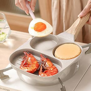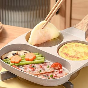 A frigideira apresenta um design inteligente com compartimentos ou seções separadas, permitindo que você cozinhe diferentes tipos de alimentos simultaneamente.