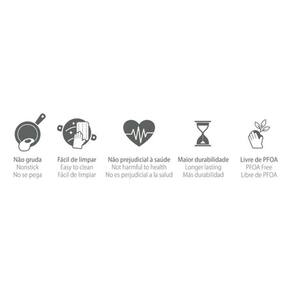 Corpo de alumínio com espessura de 1,2 mm que proporciona cozimento rápido e uniforme. Revestimento interno e externo de antiaderente Starflon Max que não gruda, é fácil de limpar, mais durável e não é prejudicial à saúde, pois é livre de PFOA. Cabo de baquelite antitérmico que oferece segurança durante o manuseio. Pode ir à máquina de lavar louças facilitando seu dia a dia.
