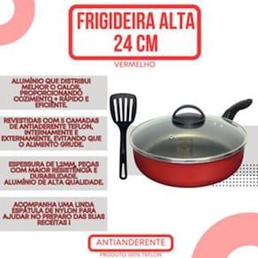 Frigideira Alta Funda 24 cm Antiaderente Teflon com Tampa de Vidro + Espátula Nylon Vermelho Frigideira 24cm com 5 camadas de Teflon Antiaderente com Tampa de Vidro + Espátula Nylon