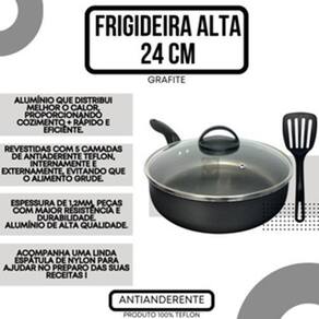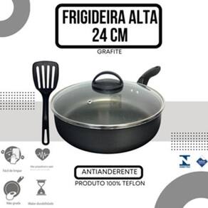 Frigideira Alta Funda 24 cm Antiaderente Teflon com Tampa de Vidro + Espátula Nylon Preta Frigideira 24cm com 5 camadas de Teflon Antiaderente com Tampa de Vidro + Espátula Nylon
