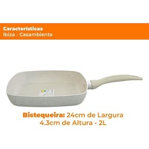 Frigideira Bistequeira Antiaderente Revestimento Cerâmico Ibiza 24cm - Casambiente A Frigideira Ibiza Vanilla possui revestimento antiaderente em cerâmica e 2,5mm espessura em sua estrutura, o que melhora o preparo de seus alimentos, pois a temperatura é dissipada de maneira uniforme e favorece o cozimento, evitando que sua comida queime facilmente. É produzida em alumínio na cor vanilla com revestimento cerâmico marble classificação A do Inmetro, não gruda, é mais fácil de limpar e mais saudável, pois necessita de menos óleo para o cozimento e é livre de metais pesados. Possui cabo com acabamento siliconado Soft-Touch da mesma cor da frigideira, que dá um toque macio e não esquenta, evitando acidentes e trazendo um design inovador, ideal para você que gosta de sofisticação e elegância em sua cozinha. É indicada para fogão a gás, vitrocerâmico ou elétrico. Dimensões: 24cm de largura x 4,3cm de altura Capacidade: 2,0L Recomendações: - Lavar, untar com óleo e aquecer antes da primeira utilização. - Usar somente utensílios de madeira, silicone ou nylon. - Utilizar fogo médio ou baixo, pois a frigideira distribui uniformemente o calor. - Não esquentar o produto vazio. - Utilizar o lado macio da esponja e evitar uso de abrasivos - Indicado para fogão a gás, vitrocerâmico e elétrico. Características: Marca: Casambiente Modelo: Ibiza Vanilla Referência: AL183 Material da Frigideira: Alumínio Material do Cabo: Baquelite Siliconado Soft-Touch Revestimento Interno: Cerâmico Espessura: 2,5mm Cor: Vanilla Quantidade: 1 peça Imagens ilustrativas. Marca: Não Informado Ean: 7898583261986