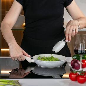 Característica-1 - DIFERENCIAIS: a Frigideira com Indução 24 cm da Linha Ceramic Life Sirius/Brinox na cor Vanilla tem estrutura de alumínio que distribui o calor de forma homogênea. O cabo em baquelite tem acabamento soft-touch com efeito amadeirado e garante o manuseio com segurança. O revestimento é um antiaderente em três camadas com a tecnologia Mineral Resist, que reduz a necessidade do uso de óleo no preparo de alimentos e facilita a limpeza. É mais tecnologia, beleza e durabilidade na sua cozinha.