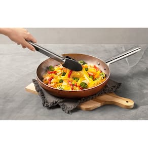 Ninguém duvida da versatilidade da frigideira. De um simples ovo frito até uma receita de pizza, a peça pode ser sua maior parceira na cozinha. A frigideira da linha Curry é ideal para acompanhar suas invenções. O charme fica por conta da cor cobre da peça, um toque iluminado na cozinha. O revestimento interno antiaderente exige menos óleo no preparo dos alimentos e é mais fácil de limpar. A estrutura em alumínio faz com que a frigideira esquente lentamente e mantenha o calor, garantindo um cozimento por igual. O cabo da peça é de aço inox. A frigideira tem 28x5,5cm de diâmetro e 2,55 litros de capacidade._x000D_