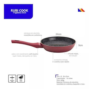 Frigideira cerâmica antiaderente indução 24cm rubi cook mimo styleA frigideira da linha rubi cook da mimo style é o item ideal para compor sua cozinha com seu design diferenciado, moderno e sofisticado. A panela possui 3 camadas, sendo duas de revestimento cerâmico e uma camada resistente a altas temperaturas. Com estrutura de alumínio as panelas possuem 4mm de espessura que proporciona uma maior durabilidade do produto, como também mais uniformidade térmica, cozinhando os alimentos de maneira uniforme, sem variações de temperatura. Sem contar que elas também mantêm o calor por mais tempo mesmo fora do fogo, possibilitando refeições aquecidas até mesmo à mesa. Com revestimento soft-touch, toque super macio, em seus cabos e alças, confortável ao segurar e previne queimaduras.Possui fundo triplo que pode ser utilizado nos fogões a gás em fogo baixo , elétrico, vitrocerâmico e no cooktop de indução. O sistema de indução funciona através de ondas eletromagnéticas, estimuladas pelas propriedades magnéticas presentes no fundo da panela. Assim, o fogão de indução só aquece quando as duas superfícies entram em contato.Graças a condutibilidade de calor rápida e eficiente do alumínio, cozinhar em temperatura baixa ou média é suficiente, reduz o consumo de gás e energia elétrica. O revestimento cerâmico não deixa o alimento grudar, permitindo o uso de menos óleo, facilitando a limpeza. É livre de metais pesados, e elementos prejudiciais à saúde pfoa free , por isso possui classificação a ótima no inmetro.- design: a frigideira foi projetada em alumínio com revestimento cerâmico, possui um fundo triplo para fogão de indução. Com sua característica antiaderente, diminui a necessidade de usar azeite e óleo. O cabo possui revestimento com tecnologia soft-touch, toque macio e confortável ao segurar, prevenindo acidentes e queimaduras.- adequadas para todos os fogões: a frigideira pode ser utilizada em todos os tipos de fogões elétricos, vitrocerâmicos, gás e indução. O material conduz o calor de forma uniforme, reduzindo o consumo de gás e energia, permitindo que você cozinhe os alimentos em fogo baixo ou médio.- para qualquer necessidade: é a aliada perfeita no preparo de suas refeições. Extremamente prática para uso diário, pode ser utilizada no preparo do seu café da manhã ao jantar. Prepare omeletes, ovos mexidos, carnes, vegetais e outros diversos tipos de alimentos com nossa frigideira para completar suas refeições.- cozinha saudável: a frigideira possui um revestimento antiaderente, reduzindo o uso e consumo de óleo e azeite no preparo de suas refeições. O seu material permite a condução do calor por igual em toda a frigideira reduzindo também o uso de energia elétrica e gás.- fácil higienização: os produtos indicados para a limpeza do produto são: detergente suave e/ou neutro e água morna. Aplique com um pano macio ou uma esponja de nylon, enxague e seque. Não utilize abrasivos e palha de aço. Não é recomendável o uso em lava-louças, fornos ou micro-ondas.Especificações técnicas:Modelo: frigideira 24cm rubi cookComposição: alumínio e baqueliteCapacidade: 1,6 litros / 620gIndicada para fogões: elétrico, indução, gás e vitrocerâmicoConteúdo da embalagem: 01 unidadeDimensões l x a x c : 24 x 5 x 43,5cmDiâmetro: 24cmPeso: 630g