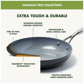 Infundido com diamantes, o revestimento antiaderente de cerâmica saudável Thermolon Minerals Pro da GreenPan é livre de PFAS, PFOA, grafite e cádmio, por isso nunca liberará gases tóxicos, mesmo se for superaquecido acidentalmente para utensílios de metal, nosso revestimento antiaderente com infusão de diamante oferece durabilidade notável, aquecimento equilibrado e limpeza sem esforço A Base de Indução Magneto do Valencia Pro traz incrível queima e escurecimento para todos os fogões, incluindo indução, além do corpo de alumínio anodizado duro é incrivelmente durável e resistente a arranhões A alça de aço inoxidável polido espelhado permanece fria graças a um recorte em forma de V Adequado para todos os fogões, incluindo indução Marca: Não Informado