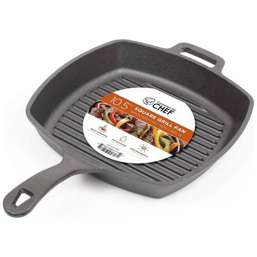 Tamanho 10,5 Panela Grelha Quadrada Esta frigideira quadrada de ferro fundido CHEF 10,5 é um complemento perfeito para a sua cozinha. Sua superfície antiaderente significa que você pode cozinhar refeições facilmente e esta frigideira quadrada de ferro fundido vem pré temperada para garantir um ótimo desempenho. A distribuição uniforme do calor nesta frigideira de ferro fundido pré temperada garante a retenção de calor para seus pratos deliciosos que toda a família irá saborear. Use ao ar livre em sua churrasqueira ou fogo aberto, bem como dentro de seu fogão ou forno. Esta panela de ferro fundido é nervurada, o que ajuda a elevar suas carnes e vegetais favoritos de gordura e óleo, deixando lindas marcas grelhadas que seus convidados vão admirar. Basta lavar à mão com detergente suave, secar bem com uma toalha. Pendure convenientemente em sua cozinha com furos de alça para zenamento ideal. Esta frigideira quadrada de ferro fundido CHEF certamente será um item básico para suas receitas da semana e do fim de semana Marca: Não Informado