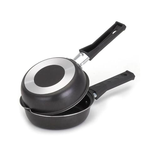 Frigideira Dupla Hamburgueira e Omeleteira Antiaderente Com essa frigideira você poderá preparar diversos tipos de refeições, como fritar hamburguer para aquele lanche caseiro, fritar ovos, fazer queijo derretido, aquecer pães, dentre outros alimentos, de forma prática e sem fazer sujeira no fogão. A frigideira antiaderente facilita no momento de lavagem, e permite que os alimentos não grudem. Utilize talheres de silicone, madeira ou nylon, isso faz com que as propriedades antiaderentes dure prazo. Feita com cabos de baquelite, dando mais segurança e evitando possíveis queimaduras. - CABO EM MATERIAL RESISTENTE. - ANTIADERENTE. - FOGO MÉDIO A BAIXO. - NÃO DEIXAR ENTRAR EM CONTATO COM ÁGUA QUANDO ESTIVER QUENTE. ESPECIFICAÇÕES: Material: Alumínio Dimensões: Comprimento 25cm x Alt.: 4cm x Diâmetro: 14cm Peso: 215g aprox. Cor: Preto CONTÉM: 01 Frigideira Dupla Hamburgueira e Omeleteira Antiaderente 14cm Preto