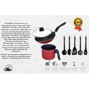 Contem 1 frigideira 16 cm com tampa vidro temperado 1 fervedor 14 cm sem tampa 1 jogo de utensílios 5 peças de nylon Marca: Heraa
