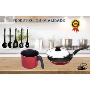 Frigideira e fervedor antiaderente com jogo de utensílios de cozinha cor vermelho Kit frigideira fervedor antiaderente com jogo de utensílios de cozinha de nylon