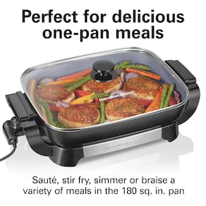 simPERFEITO PARA DELICIOSAS REFEIÇÕES EM UMA PANELA: prepare convenientemente uma variedade de refeições com a superfície de cozimento antiaderente de 180 polegadas quadradas da frigideira elétrica. Você pode refogar, fritar, ferver ou refogar as refeições da família em uma panela — não é necessário sujar uma segunda panela.