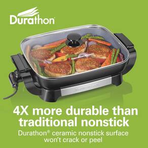 QUATRO VEZES MAIS DURÁVEL DO QUE O ANTIADERENTE TRADICIONAL. A superfície antiaderente de cerâmica Durathon nesta panela elétrica é quatro vezes mais durável do que o antiaderente tradicional e não racha nem descasca. Além disso, é livre de PTFE e PFOA.