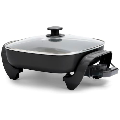 Se você procura por uma cozinha completa que pode ser apenas conectada, não procure mais. Com a Frigideira Elétrica 5 em 1 GreenLife, você pode fritar, refogar, assar, grelhar, cozinhar no vapor e muito mais. Nosso revestimento antiaderente cerâmico saudável foi especialmente projetado para aparelhos de cozinha, proporcionando um desempenho antiaderente ideal. Além disso, nosso revestimento é livre de PFAS, PFOA, grafite e cádmio, permitindo que você cozinhe de forma mais saudável. Com capacidade de 4,7 Litros e área de superfície de 30,48 x 30,48 cm, você tem espaço suficiente para porções grandes que toda a família pode desfrutar, desde grandes lotes de panquecas e ovos de manhã até deliciosas lasanhas e filés de frango à noite. O controle de um botão permite ajustar a temperatura desejada para resultados perfeitos, enquanto os cabos frios ao toque e a base antiderrapante mantêm você confortável e no controle. Além disso, a tampa de vidro temperado mantém o calor, a umidade e o sabor enquanto você acompanha o progresso das refeições. Basta limpar a frigideira quando terminar ou colocá-la na lava-louças para sujeiras difíceis. Não perca a chance de ter uma cozinha saudável e funcional com a GreenLife!