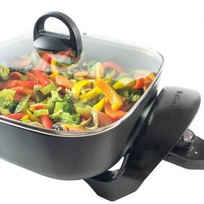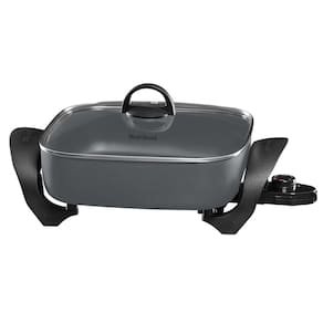 nãoFrigideira elétrica West Bend SKWB12GY13 de tamanho familiar com tampa e Diamond Shield, acabamento antiaderente resistente a arranhões, 12 por 12 por 3 polegadas, cinza - Frigideira/chapa elétrica antiaderente: revestimento forte, sem PFOA e com infusão de diamante, evita que os alimentos grudem para maior durabilidade, facilidade de cozimento e limpeza mais rápida - Cozinha familiar em 1 panela: esta frigideira antiaderente mede 3 polegadas de profundidade e 12 por 12 polegadas quadradas, o que significa que você pode cozinhar uma refeição inteira para toda a família em 1 panela - Tampa de vidro temperado com ventilação: a tampa transparente da panela permite que você veja facilmente sua comida e libera vapor para ajudar a evitar a condensação para um cozimento mais uniforme - Controle de temperatura ajustável: projetada para oferecer controle preciso da temperatura para cozinhar e aquecer, esta panela elétrica para cozinhar possui um termostato ajustável e removível - Componentes laváveis na máquina de lavar louça: tampa de vidro e frigideira antiaderente podem ser lavadas na máquina de lavar louça para facilitar a limpeza