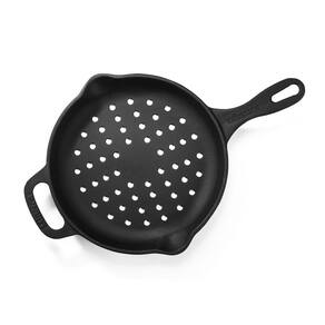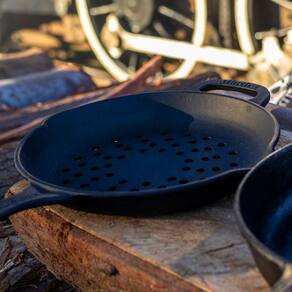 A Frigideira Vazada Grill Estilo Cabo e Alça de Ferro da Panela Mineira oferece um design moderno e autêntico, com fundo reto perfurado e lados baixos e inclinados para facilitar o manuseio e escoamento de líquidos. Sua excepcional distribuição e retenção de calor, típicas do ferro fundido, a tornam perfeita para grelhar. Um produto completo, prático e resistente, indicado para carnes, legumes e outros.
