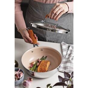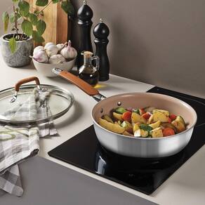 A frigideira funda com tampa Tramontina Romagna em aço inox e alumínio com revestimento interno cerâmico marfim 24 centímetros de diâmetro e 3,1 litros é sinônimo de eficiência e estilo. Seu espaço interno amplo permite cozinhar grandes porções de alimentos de forma rápida e prática, perfeita para refeições em família. O revestimento cerâmico proporciona um cozimento uniforme e facilita a limpeza. A Tecnologia Biply Induction, que une aço inox e alumínio, torna a frigideira com todos os tipos de fogões, inclusive os de indução. A tampa de vidro temperado permite o controle do cozimento sem perder calor ou umidade dos alimentos, otimizando o preparo. Com um design sofisticado e cabo com protecão de silicone, essa frigideira oferece praticidade e segurança, além de adicionar um toque moderno e elegante à sua cozinha. Eleve sua experiência culinária com a Tramontina Romagna!