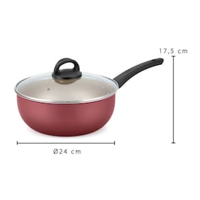 Panela Frigideira Wok 24 com Tampa de Vidro Alumínio Nacional As Woks garantem rapidez no preparo graças ao seu formato. Com seu revestimento, proporciona um cozimento muito mais saudável, pois exige baixa utilização de gordura, preservando ainda mais as propriedades nutritivas dos alimentos, ressaltando o sabor de seus pratos. Wok produzida em alumínio com revestimento antiaderente interno e externo, cabo em baquelite antitérmico. Possuir tampa em vidro temperado com saída de vapor e borda de aço inox. Cuidados: Antes de usar pela primeira vez, lave-o com água, detergente e esponja macia. Enxague e seque o produto em seguida unte seu interior com algumas gotas de óleo, leve-a ao fogo baixo por 2 minutos. Deixe esfriar e lave o produto novamente. Não utilize objetos de metal ou pontiagudos. Medidas aproximadas: Diâmetro: 24cm Altura: 16cm Largura com tampa: 26cm Comprimento: 39cm Ean: 7898211765299