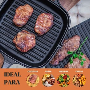 Modelo: Frigideira Grill Quadrada Cabo e Alça de Ferro 26×26cm 1,8L Material da peça: ferro fundido Material do cabo: ferro Material da alça: ferro Medidas: 26 × 26 × 4,5cm Capacidade: 1,8 L Peso aproximado: 3,13 kg Compatível com fogão: indução, gás, elétrico, vitrocerâmico, lenha, forno Já vai curado. Pronto para uso Revestimento atóxico (camada protetora) Garantia: 90 dias contra defeitos de fabricação Remover peças de madeira antes de levar ao forno