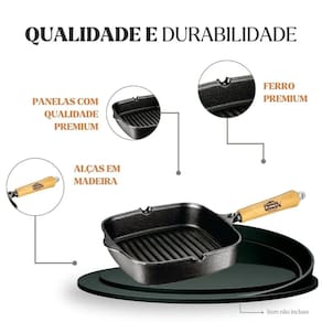 Frigideira Grill Quadrada fabricada em ferro fundido, indicada para o preparo de carnes, legumes, peixes e grelhados em geral, proporcionando marcas de grelha bem definidas, cozimento uniforme e excelente retenção de calor. O ferro fundido garante estabilidade térmica e conservação do sabor, enquanto o cabo em madeira naval oferece segurança no manuseio e agrega charme ao servir.