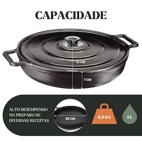Material da peça: Ferro fundidoMaterial da alça: FerroMaterial da tampa: MetálicaCor: PretaMedidas: 36 × 12 cmCapacidade: 6,4 LPeso aproximado: 7 kgCompatível com fogão: Indução, gás, elétrico, vitrocerâmico, lenha, fornoJá vai curada. Pronta para usoRevestimento atóxico: Camada protetoraGarantia: 90 dias contra defeitos de fabricação