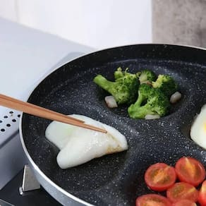 Frigideira Preta 24,5cm Antiaderente com 4 Divisórias Ovos Frigideira Preta 24,5cm Antiaderente com 4 Divisórias Ovos ===================================== Fabricada em alumínio com revestimento antiaderente do tipo, ela garante cozimento uniforme, evita que os alimentos grudem e permite preparar refeições mais saudáveis com menos uso de óleo.