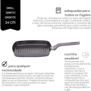 TIPOS DE FOGÕES: Nossa linha Sartin Cook Grafite pode ser utilizada em fogões elétricos e a gás. O material conduz o calor de maneira uniforme, reduzindo o consumo de gás e energia, dessa forma permitindo que você cozinhe os alimentos em fogo baixo ou médio. Atenção: Produto não recomendado para fogão de indução e vitrocerâmicos.