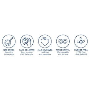 Corpo de alumínio com espessura de 1,8 mm que proporciona cozimento rápido e uniforme. Revestimento interno e externo de antiaderente Starflon Max que não gruda, é fácil de limpar, mais durável e não é prejudicial à saúde, pois é livre de PFOA. Cabo de baquelite antitérmico que oferece segurança durante o manuseio. Espátula de Nylon que permite uso em temperaturas de até 180 C e cabo com furo passante possibilitando que seja pendurado na sua cozinha. Podem ir à máquina de lavar louças facilitando seu dia a dia. NA Ean: 7891112292185