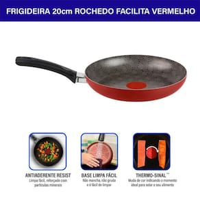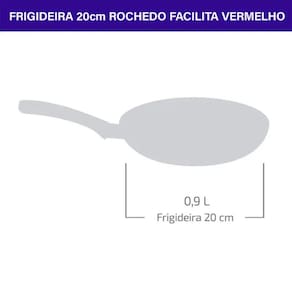 Características: Marca: Rochedo Modelo: Facilita Tipo: Frigideira Diâmetro da panela: 20 cm Material: Alumínio Revestimento interno: Antiaderente Cabo: 16,4 cm pode ser levado a: Pode ir em todos os tipos de fogões, exceto indução.