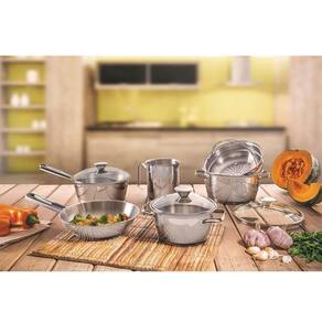 - Totalmente produzida em aço inox, possui tecnologia de fundo triplo (aço inox + alumínio + aço inox) distribuindo o calor de forma uniforme, cozinhando os alimentos mais rápido.