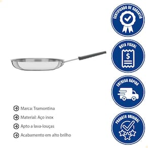 - Cozinhe como um verdadeiro chef com a Frigideira Tramontina Professional 30 cm em inox com fundo triplo, que distribui o calor de forma uniforme e garante preparo rápido e preciso.