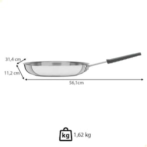A frigideira é totalmente em aço inox, possui 30 cm de diâmetro e fundo triplo, garantindo aquecimento uniforme e durabilidade.
