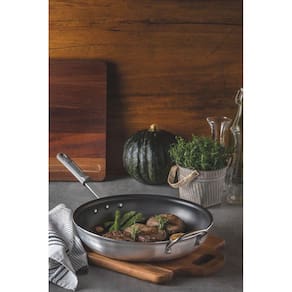 Frigideira Tramontina Profissional em Alumínio Acabamento Externo Lixado com Revestimento Interno Antiaderente Starflon T3 Cabo 36 cm 5,7 L Com a Frigideira Tramontina Profissional em Alumínio Acabamento Externo Lixado com Revestimento Interno Antiaderente Starflon T3 Cabo 36 cm de diâmetro 5,7 L a sua cozinha se tornará em um ambiente ainda mais profissional. Por ser produzida em alumínio com acabamento externo lixado, ela oferecerá brilho e modernidade para o ambiente. Graças ao seu revestimento interno antiaderente Starflon T3 com maior poder de antiaderência, maior resistência a abrasão, maior durabilidade, maior facilidade na limpeza e livre de PFOA, você terá mais agilidade para realizar preparos, como saltear e finalizar pratos no formo. Seu cabo de aço inox com luva de silicone e alça de aço inox torna o manuseio confortável e agradável. A frigideira, da linha Frigideiras Profissionais, é a peça ideal para todos que desejam realizar grandes receitas e tornarem-se referência na gastronomia. Informações Gerais Corpo de alumínio com acabamento externo lixado. Espessura da peça de 3,6 mm: distribuição uniforme do calor. Revestimento interno de antiaderente Starflon T3. O único com a tecnologia T: maior poder de antiaderência; maior resistência à abrasão; maior durabilidade; mais fácil para limpar e livre de PFOA, garantindo uma resistência à abrasão mais de 15.000 ciclos baseado na Norma ABNT NBR 15321:2013. Cabo de aço inox com luva de silicone removível. Maior proteção contra o calor. Sistema de fixação do cabo com 3 rebites. Maior segurança e estabilidade durante o uso. Alça de aço cromado.