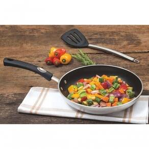 Antes do uso: Antes de utilizar o , remova as eventuais etiquetas e lave-o com água quente e de uso: Antes de usar a frigideira pela primeira vez, remova eventuais etiquetas e lave-a. Em seguida, unte a superfície com óleo e aqueça a frigideira, em fogo baixo, por 2 a 3 minutos, dependendo do tamanho da frigideira. Espere esfriar e lave-a com esponja e detergente neutro em água morna. Após, enxágue-a. Quando cozinhar alimentos, sempre use fogo baixo ou médio. Isso ajuda a preservar seus nutrientes. Quando a frigideira for utilizada no fogão a gás, a chama não deve ultrapassar a base da frigideira. No caso de chama elétrica, ela deverá ter diâmetro igual ou inferior ao da frigideira. Para preservar o revestimento, não utilize utensílios com pontas metálicas. Para isso, recomendamos utilizar apenas utensílios de nylon, silicone ou madeira. Não aqueça o alimento colocando uma frigideira do mesmo diâmetro sobre outra. Esse procedimento é perigoso, pois cria vácuo e impossibilita sua retirada. Não deixe a frigideira vazia sobre uma fonte de calor. Deixe a frigideira quente somente em superfícies resistentes ao calor. Sempre deixe a frigideira esfriar antes de mergulhá-la na água. Se deixar queimar os alimentos, deixe a frigideira de molho em água durante algum tempo antes de lavá-la.- Foto meramente ilustrativa.- Embalagem litografada.
