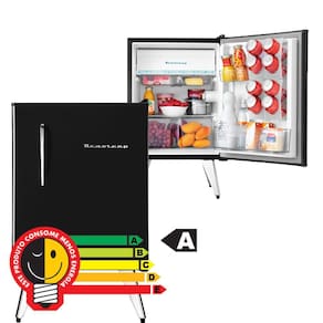 Frigobar com design retrô, cor preta, com congelador, compartimento extra frio, gaveta multiuso, pés cromados, porta latas, separador de garrafas, logo brastemp anos 50 e puxador cromado