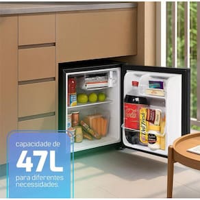 Frigobar com 1 prateleira removível de aço, caixa coletora de água, porta reversível e porta-garrafa. Não possui iluminação interna, porta-latas, bandeja de ovos e freezer. Gás ecológico R600a.Características