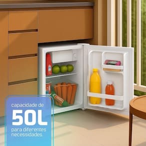 Frigobar com 50L de capacidade, classe energética A+++, termostato mecânico com 5 níveis de ajuste, faixas de temperatura de 0-10°C (refrigerador) e 0 a -6°C (chiller), degelo manual, gás refrigerante R600a, classe climática T, porta reversível e prateleiras removíveis.Características